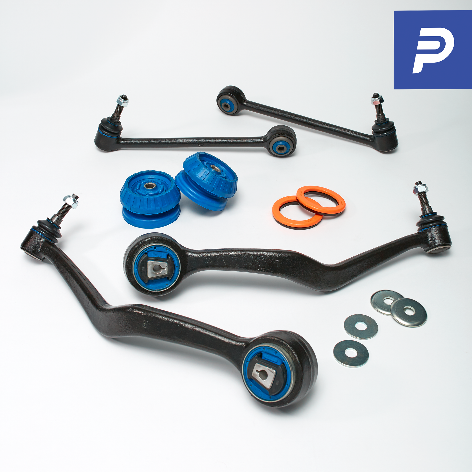 The kit comes with all 4 Control Arms as well as a pair of Polyelast enhanced Strut Top Mounts complete with bearings. The arms include new strengthened ball joints. (Our testing shows that some aftermarket ball joints are only 1/3 as strong as the original design). The bushes are the same hydraulic damped design adopted by the OEMs, so no unwanted transfer of noise vibration or harshness. This kit offers the highest level of performance, durability and safety without compromising ride or vehicle comfort.